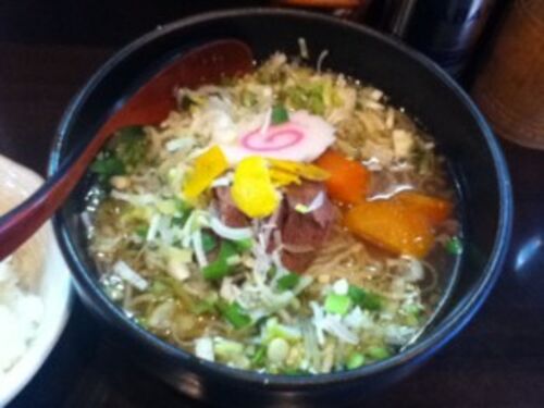 牛スジ柚子韮麺 750円 12月のオリジナル麺。 カウンターに座り、サービスのライスもお願いする。 丼が到着。 スープは塩かな。胡椒がたっぷり効いている。 麺は細縮れ麺。 牛スジは大きな塊で、箸で崩れるほど柔らかく煮こまれている。 ニンジンも同じ鍋で煮…