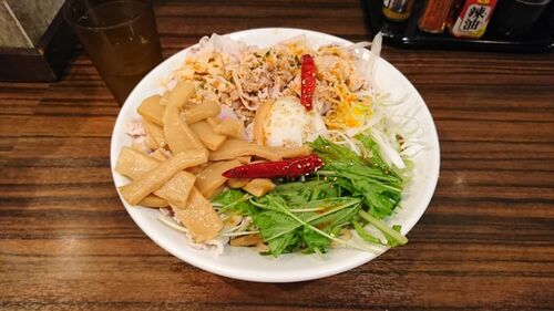 ピリ辛冷やし胡麻だれそば(並) 900円 + 肉増し 0円 + メンマ 100円→0円 夏季限定メニュー。 以前にも食した事のある冷やし胡麻ダレが、ピリ辛になって再登場。 肉増し券で肉増量し、トッピング定期券でメンマをお願いした。 豚しゃぶ・笹切りネギ・水菜・追…
