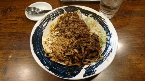 汁なし担々麺 900円 6月末までの限定メニューをこちらでいただく。 前回もだったが、夜遅くはライスが売り切れでセットにできなかった。 茹で時間長めで深皿が登場。見た目は「キンシャリ屋」のものとそれほど変わらない。 担々肉味噌・モヤシ・長ネギのみじ…