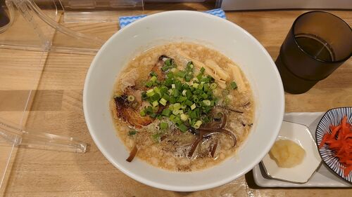博多豚骨ラーメン 900円 6月の限定メニューが気になったので、久しぶりに訪問。 店舗向かいのスペースで食券を購入して、店内へ。 食券を渡す際に、麺の硬さをバリカタでお願いした。 暫し待って、逆さ富士型の丼が登場するが、座っている位置と提供口の間に…