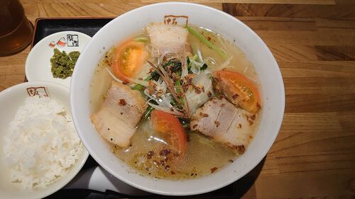 青唐うま塩ラーメン・夏(2辛) 970円→910円 + 半ライス 100円→0円 6/14スタートの夏季限定メニュー。 ランチタイムは半ライス無料。 背の低いカウンター席に座り注文。 サービスの半ライスと、辛さが5辛まで増量できるとのことなので2辛でお願いした。 暫し待…