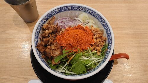 シビカラまぜそば(麺大盛り) 990円 2021年2月にオープンしたお店だが、残念ながらこの日最後の営業となった。 この辺りでは珍しく自家製麺機を備えた、本格的なラーメン店だった。 メニューは残り鶏白湯とまぜそば系のみ。 未食のまぜそばをチョイスして食券…