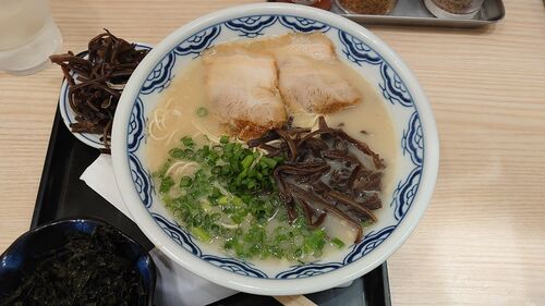 博多らーめん 720円→0円 + キクラゲ 100円→0円 + 岩磯のり 150円 + 替玉 100円 今年も誕生日クーポンで一杯いただく。 100円トッピングのクーポンでキクラゲと、岩海苔を追加。 麺はバリカタでお願いした。 暫し待って、正方形のトレイで到着。トッピングは…
