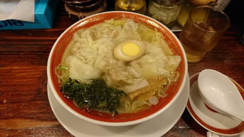 広州雲呑麺(塩) + 煮豚飯 896円 ワンタン麺がウリのお店で、ランチタイムには行列ができるほどの人気。 店頭並ぶとワンタンを手包みしている様子が見える。 回転は速いので程なく入店しカウンターに着席、ランチタイムのセットを注文する。 スープは塩で、セ…
