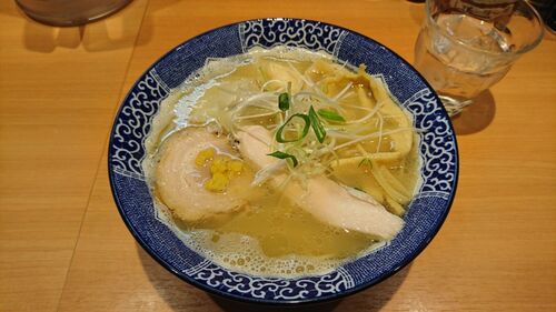 ミニワンタン中華そば(白だし) 820円 「担々麺祭り」の第三弾を求めて行ったのだが、つけ麺の麺切れとのことで 未食の「白だし」をチョイス。 丼が到着。 ワンタンの色も相まってか、まさに白と呼ぶにふさわしいビジュアル。 ハマグリやアサリの魚介と動物系…