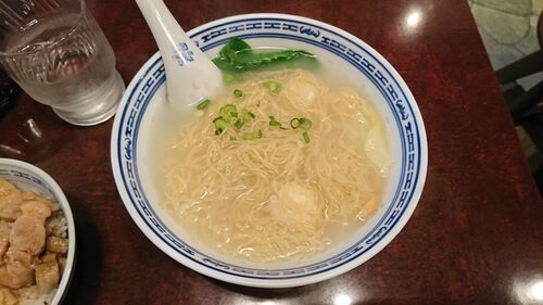 Aセット[雲呑魚蛋麺(香港麺) + 排骨飯(小) + 杏仁豆腐] 850円 先日のTBSラジオ「伊集院光とらじおと」で、 四谷三丁目店が本場の味と紹介されていたので 職場から近いこちらに来てみた。 ランチタイムはご飯物の異なるセットと、曜日替わりのセットがメイン…